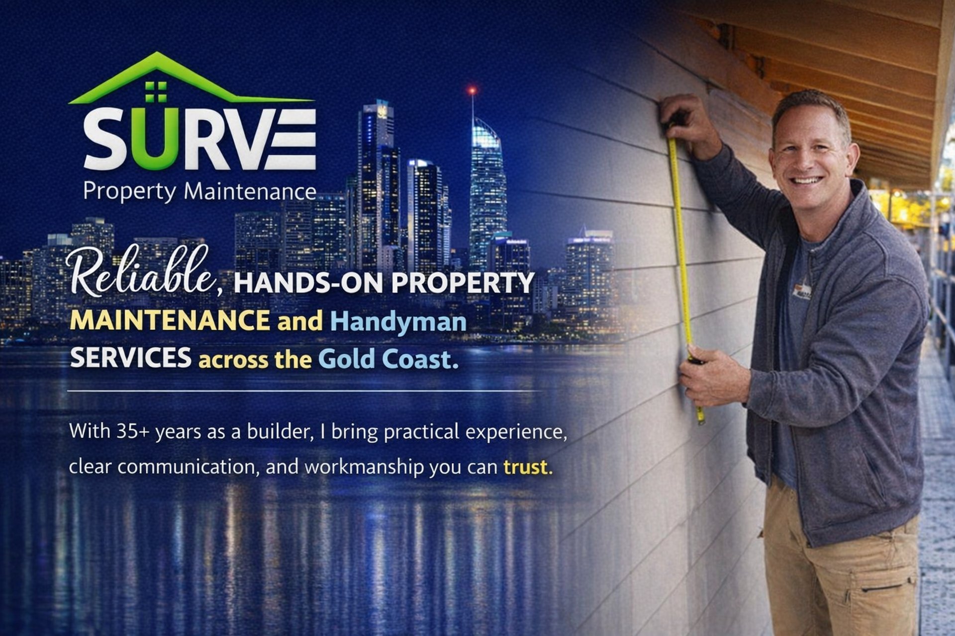 Surve Property Maintenance is your friendly, local partner on the Gold Coast for all property maintenance and handyman services. As a family‑owned business operated by Dan and Sue Weininger, we’re passionate about supporting our community and dedicated to delivering exceptional service.